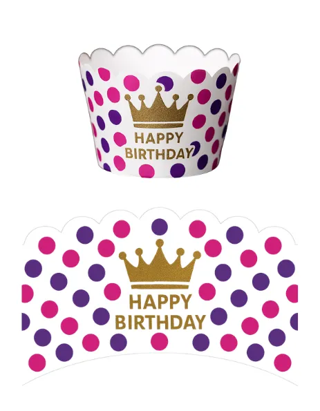Celebrate in style with this pack of 20 Royal Birthday Cupcake Wrappers, designed to add elegance and charm to any party table. Each wrapper features a crisp white base with scalloped edges, decorated with playful pink and purple polka dots for a festive touch. At the center, a shimmering gold crown sits proudly above the bold “HAPPY BIRTHDAY” lettering, making these wrappers perfect for princess parties, royal-themed birthdays, or any celebration that deserves a regal flair.