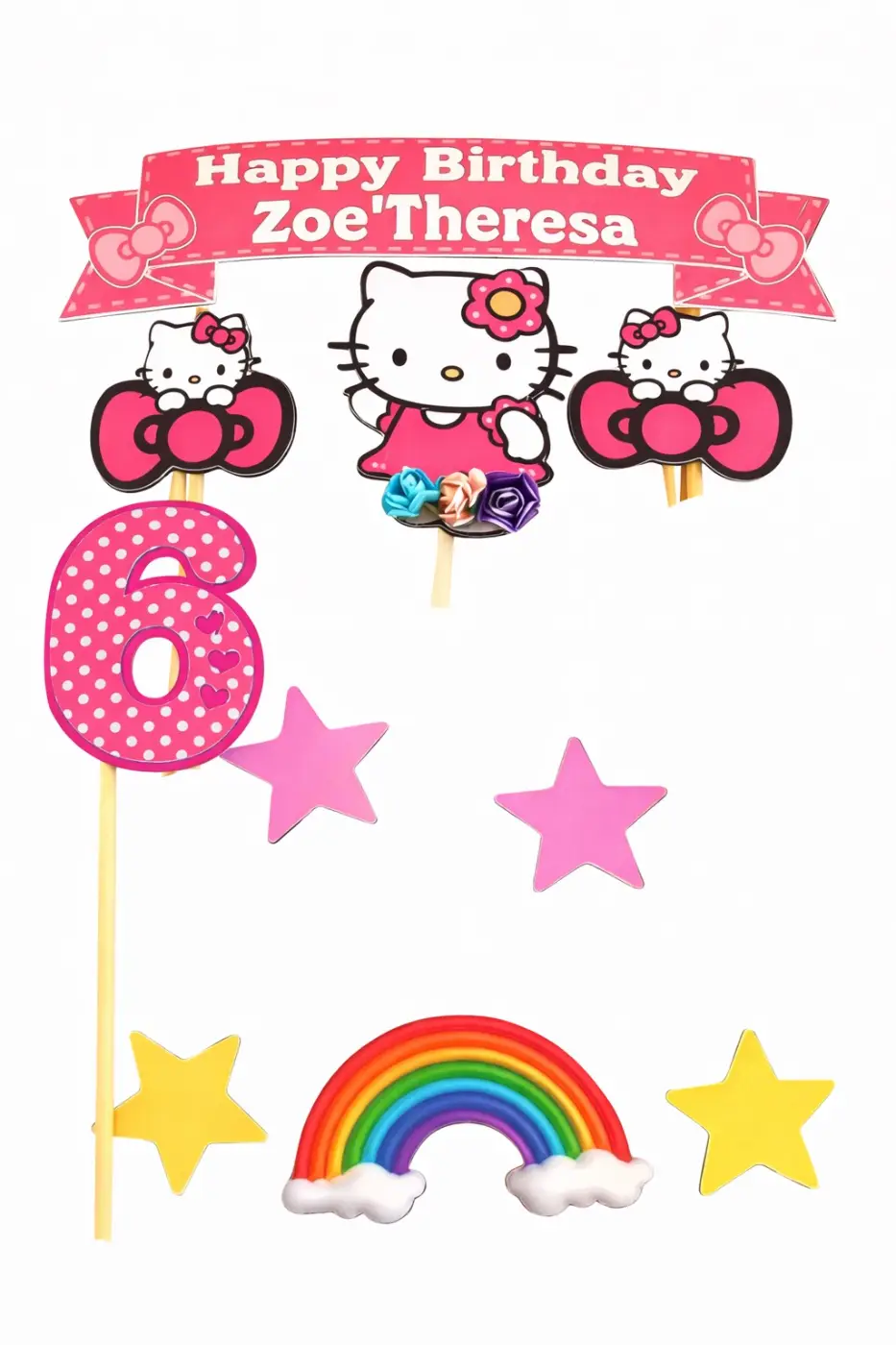Celebrate your child’s special day with this 3D Hello Kitty birthday cake topper, designed in vibrant pinks and pastels for a cheerful finish. Featuring a personalized “Happy Birthday Zoe Theresa” banner, layered Hello Kitty figures, sparkling bows, and a large polka‑dot number 6, this topper adds depth and dimension with its 3D layered cardstock design. Accented with stars, hearts, and a rainbow, it’s the perfect centrepiece for a girl’s sixth birthday party, combining playful charm with a polished, handcrafted look. Dimensions: The topper includes plenty of extras, and sizes may vary according to the images.