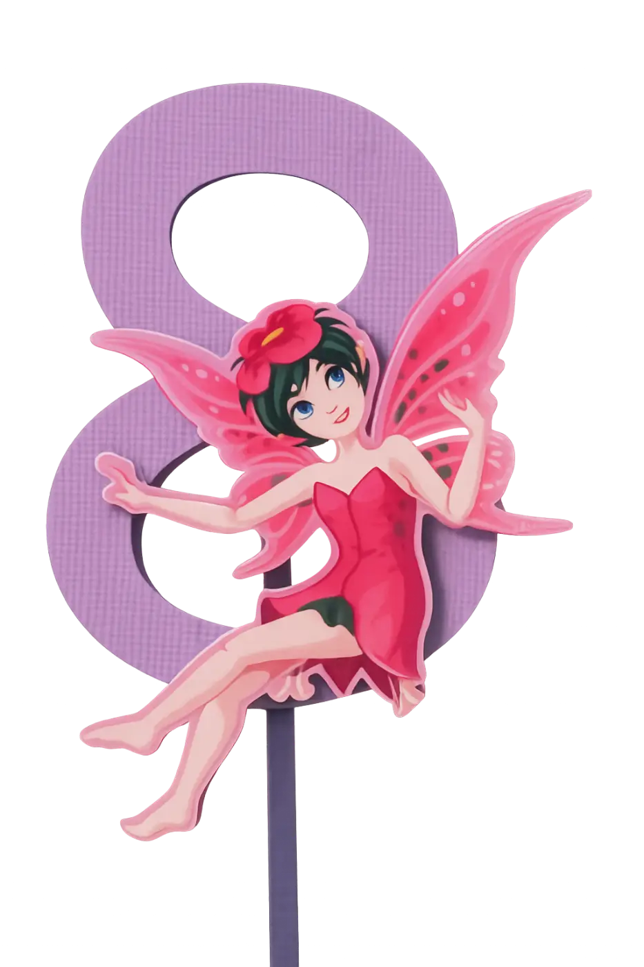 Celebrate your child’s special day with this enchanting Fairy Birthday Topper featuring the number 8. Designed with a cheerful fairy in a red dress, delicate pink wings, and a whimsical flower crown, this topper brings a magical touch to any party. The vibrant purple number eight makes it perfect for an 8th birthday celebration, while the playful design adds charm to cakes, centre pieces, or party décor. Ideal for fairy‑themed parties, this decoration is both eye‑catching and delightful, creating a memorable atmosphere for your event. Add your requests in the comments when ordering.