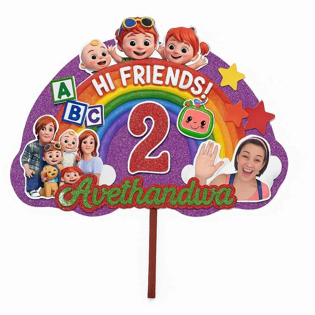 Bring the magic of CoComelon to your child’s celebration with this vibrant birthday cake topper. Featuring the beloved baby character, a cheerful school bus filled with friends, smiling stars, and a rainbow backdrop, this topper instantly adds joy and colour to any party. The bold “Happy Birthday” lettering makes it a perfect centrepiece for cakes, dessert tables, or party displays. Crafted for durability and eye‑catching appeal, it’s an ideal decoration to delight little fans and create unforgettable memories. can be fully customized—just add the age, name, event date, and preferred colours before placing your order. Price is for the topper only (cake shown is for display). Dimension 90x180x85mm